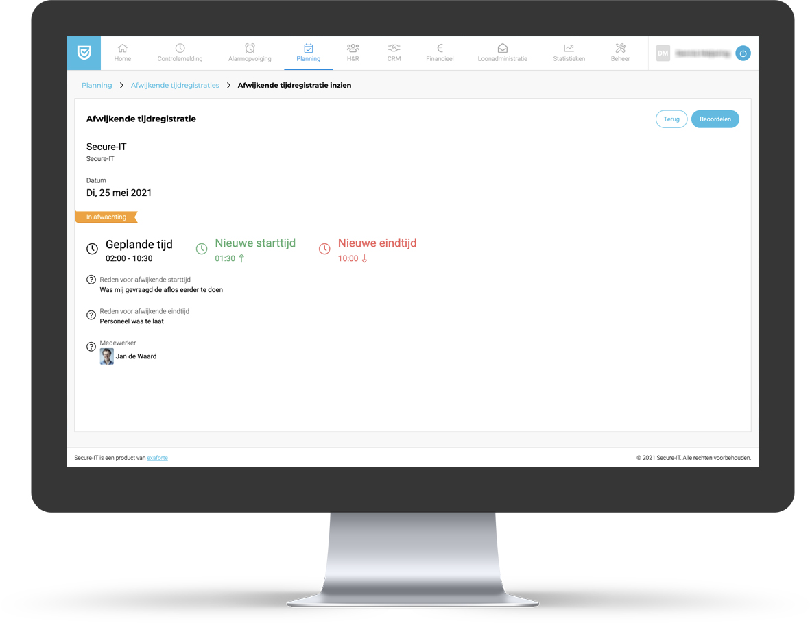 De planner krijgt van alle medewerkers een lijst te zien van al de registraties van ‘overuren’. Ook ziet de planner de redenen die zijn opgegeven voor de tijdsoverschrijdingen. Natuurlijk hoeft de oorzaak niet altijd bij de klant te liggen. Een medewerker kan bijvoorbeeld ook een foutje hebben gemaakt. Het is dan aan de planner om die extra gewerkte tijd toe te wijzen of af te wijzen. Als de planner de extra tijd accordeert, verwerkt Secure-IT dit keurig in de rapportages, facturatie en loonadministratie.